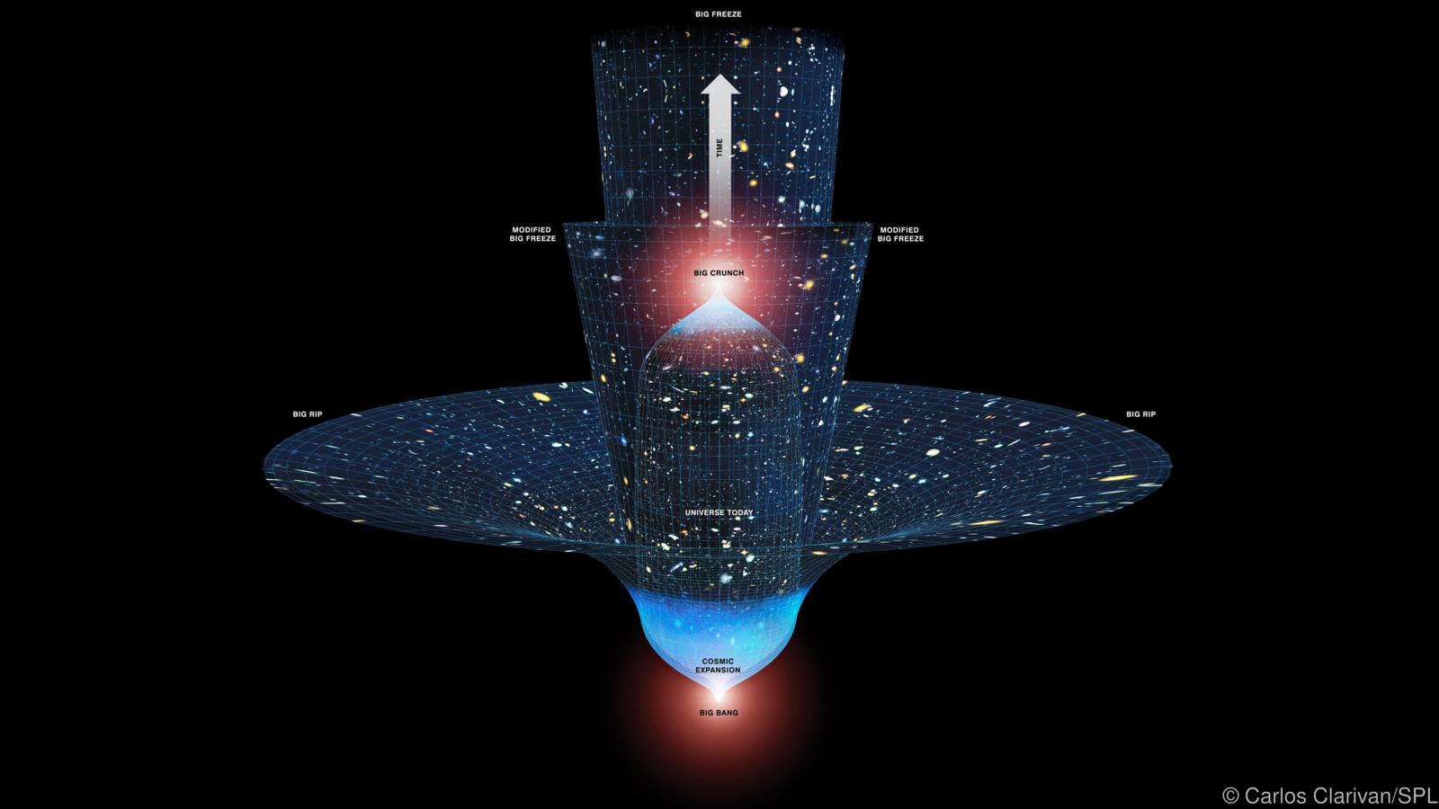 Your job is to find characteristics for EACH of the possible scenarios for the death of the Universe shown in our opening graphic