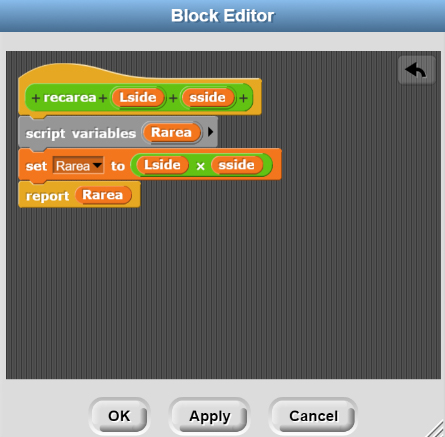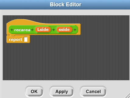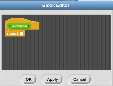 Step #3: Recall from our previous conversations that we must define HOW our function returns data or whether it returns data at all. This MUST be done when you create your function. You can't go back and change it later. My particular function is going to *receive* two pieces of data from the main program, and then return one value (the area of the rectangle). Since this function is going to return data I must choose it to be a REPORTER block.