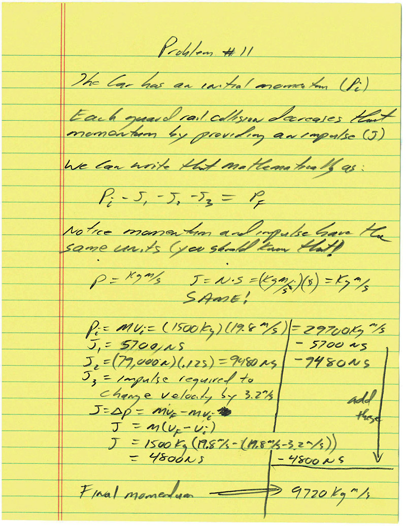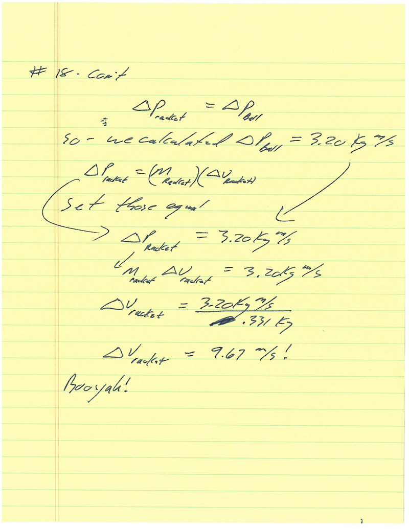 This one emphasizes our definitions. The problem takes us by the hand for the first 3 steps and then encourages us to relate the change in momentum of the racket to the change in momentum of the ball (try that FIRST before checking my annotated solution is below)