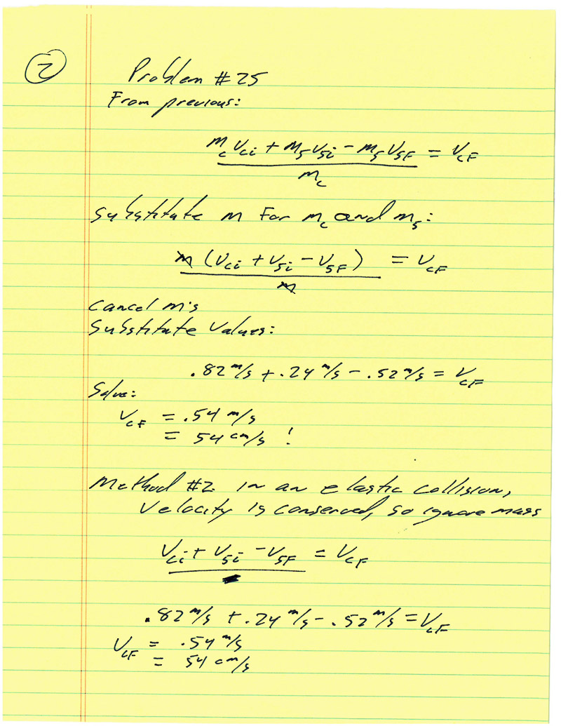 Problem #25 requires us to *assume* (boo!) that either the masses of the two billiard balls are the same (just call them 'm' and they'll soon cancel out) or that this situation is an elastic collision. In an elastic collision the kinetic energy is conserved so we don't really need a mass (*yikes*)