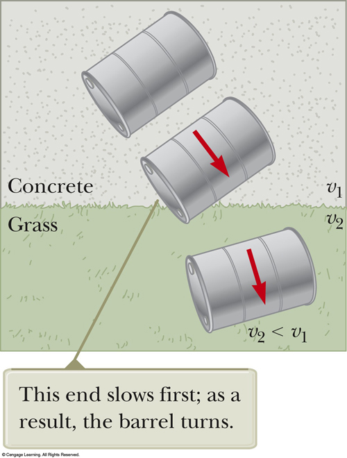 1) Please write out an explanation of why the barrel example above is such a great way to visualize refraction (1 thoughtful paragraph should do it! 2) Now please use the definition of the index of refraction together with Snell's Law to derive a relationship between the speed of the incident light ray (v1), the velocity of the refracted light ray (v2), the angle of the incident ray (Θ1) and the angle of the refracted light ray (Θ2).