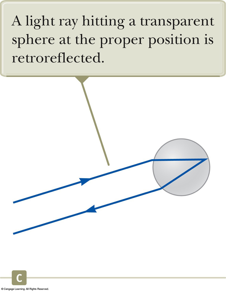 Hopefully you recognize that as the Law of Reflection... when light is reflected from a surface, the angle of incidence (the incoming light ray) = angle of reflection (the outgoing light ray). We make use of this everyday... for example you set the mirrors of your car using this law and I bet you didn't even know it! ═══════════════════════════ Here's an example of retroflection involving a spherical reflector. Notice that in this case, the light bends as it enters the reflector. Why is that? (Please discuss)