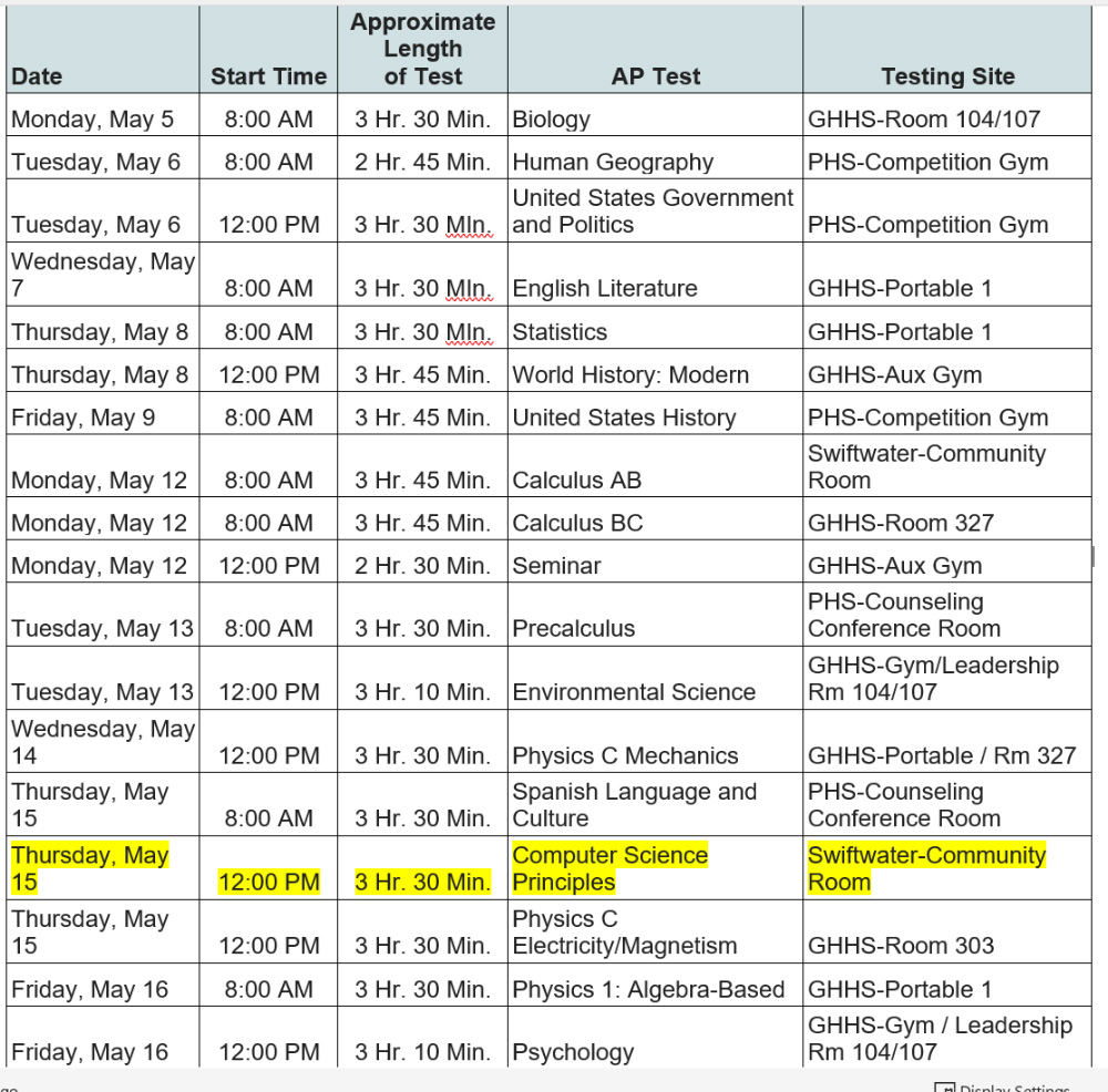 AP TEST - May 15th @ PHS "W3"