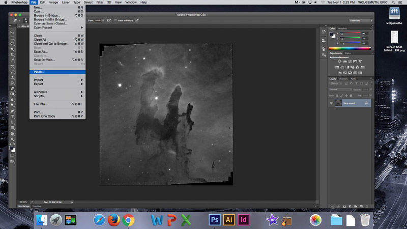 Open the second file and place it right on top of the first and click the mouse to "place" that image once it is centered.