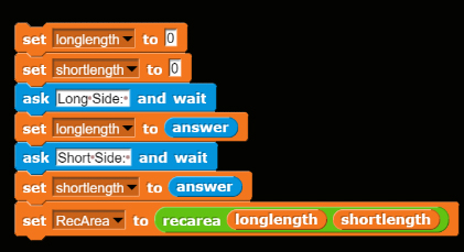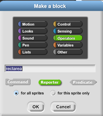 Step #3: Recall from our previous conversations that we must define HOW our function returns data or whether it returns data at all. This MUST be done when you create your function. You can't go back and change it later. My particular function is going to *receive* two pieces of data from the main program, and then return one value (the area of the rectangle). Since this function is going to return data I must choose it to be a REPORTER block.