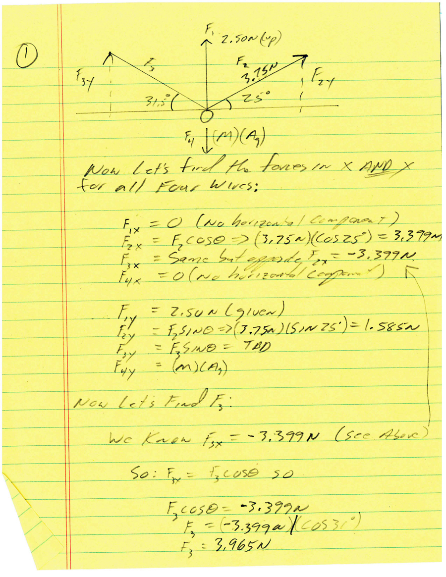 An object of unknown mass is supported by three wires hanging from the ceiling and is at rest. The first wire hangs directly down and exerts a force (F1) of 2.50 N on the object. The second wire hangs up and to the right with a force (F2) of 3.75 N at an angle of 25 degrees to the horizontal. The third wire hangs up and to the left at an angle of 31.5 degrees to the horizontal with a force (F3) of ??? N.