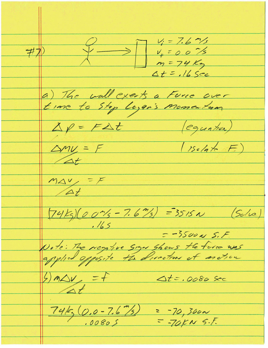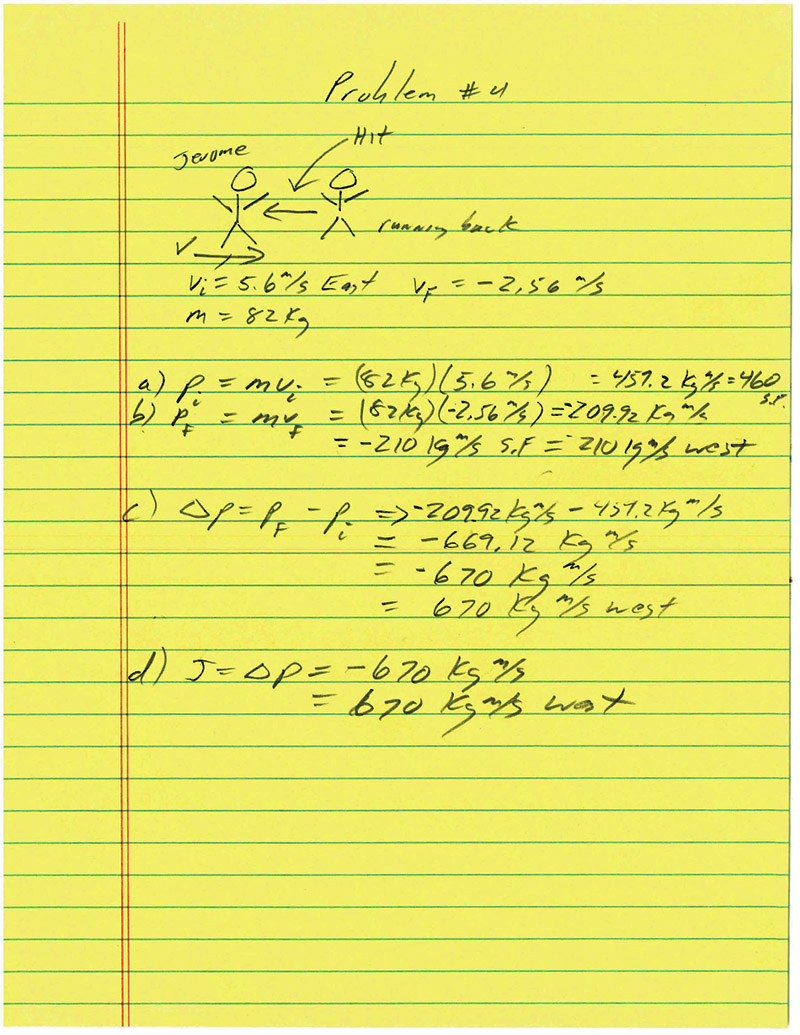 This one emphasizes our definitions. The problem takes us by the hand for the first 3 steps and then encourages us to relate the change in momentum of the racket to the change in momentum of the ball (try that FIRST before checking my annotated solution is below)