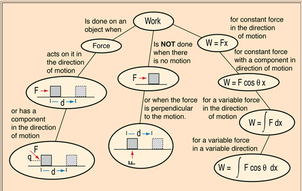 ═══════════════════════════ Let's say you are helping some friends build a wall on their back 40. You push a VERY heavy load of concrete 110 meters to the east. Your friend apologizes but notes that you went the wrong way, so you have to push the wheelbarrow 110 meters back to the west. Using physics terms, explain why you did no work at all! Let's say that you just built a 3.00 meter wall and you have to hold it up for 14 hours to let it cure. Being a good friend you struggle mightily and (somehow) manage to hold up the wall. Your arms and legs are shaking, you're breathing hard and you feel like you're going to pass out. Using physics terms, explain why you did no work at all! What are the Standard International (SI) units for work? ═══════════════════════════ This graphic comes to us from the fine folks at the University of Georgia "Hyperphysics" web site (http://hyperphysics.phy-astr.gsu.edu/hbase/hframe.html). It *can* get a wee bit dicey so take away JUST AS MUCH info as makes sense to you!